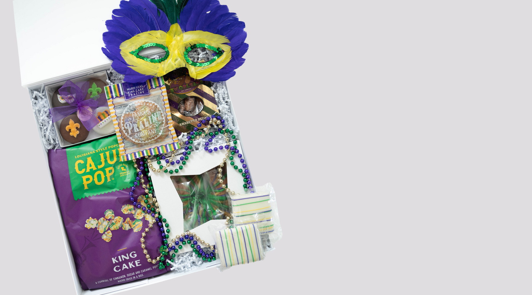 This gift box includes:Mignon Faget Rocks Glasses (2)Lolli's Chocolate Covered Pretzel RodsFleur de Lis Frosted CookieThe Big Easy Super Snack MixT...