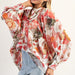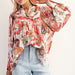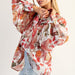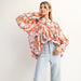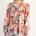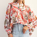 This billowy blouse showcases a vibrant allover floral print, a slight mock neckline with a split front and soft pleating, button front detailing, long balloon sleeves with buttoned cuffs, and gentle back pleats for a romantic and airy silhouette.