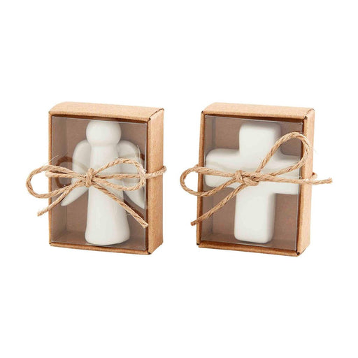 Mottled ceramic pocket size cross or angel. A little reassurance to take in a purse, car or keep on a nightstand. Each comes in kraft box inside gl...