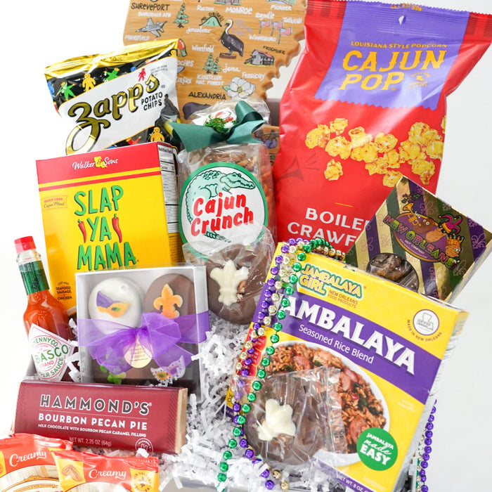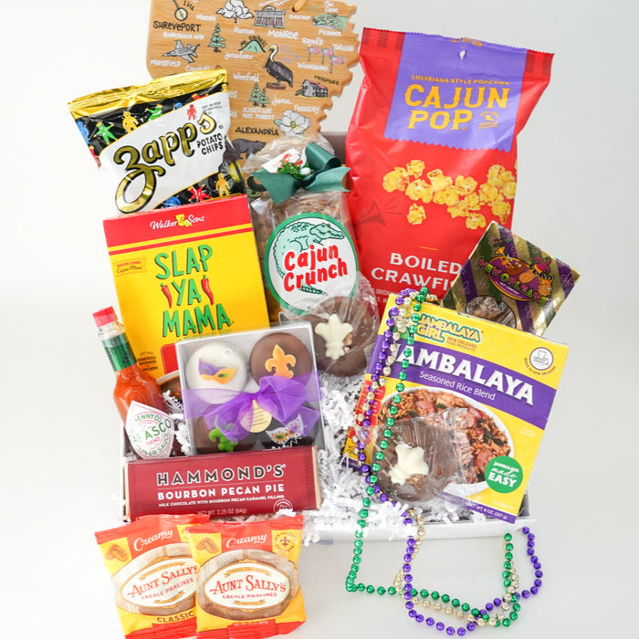 Send a taste of the south with this gift box full of locally-made snacks, mixes, and treats, paired with a beautiful hand-painted bamboo cutting board. The perfect way to say, Welcome to Louisiana!