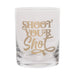 Unleash your inner mixologist with the "Shoot Your Shot" Rocks Glass. Crafted from 100% solid glass, this sturdy and transparent glass is accented with elegant gold writing, adding a touch of sophistication to your beverage experience.