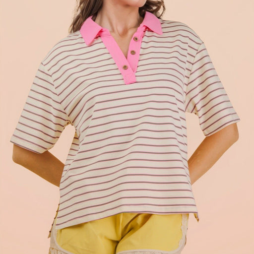 Original price $26.25 - Original price $26.25Original price$26.25$26.25 - $26.25Current price $26.25Oversized Stripe Knit Top W/ Cont Collar Button Trim Drop Shoulder Short Sleeve Side Slit