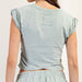 This mineral washed cropped top showcases a modern athleisure inspired design, featuring a classic crew neckline, rolled cap sleeves for a relaxed touch, an asymmetrical wrap front hem with ruched side detailing for a flattering fit, and a soft, stretchy fabric that ensures both comfort and effortless style.